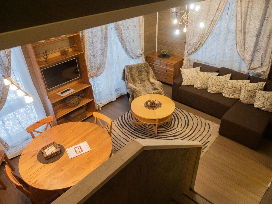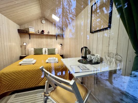 Современный коттедж рассчитан на комфортное размещение 6-ти человек. В нем предусмотрена сауна, душ и туалет, а также своя мангальная зона.
