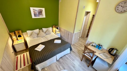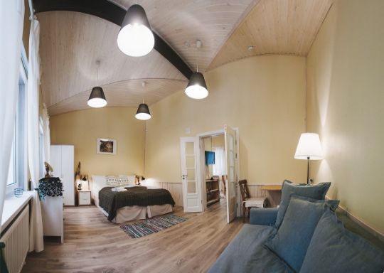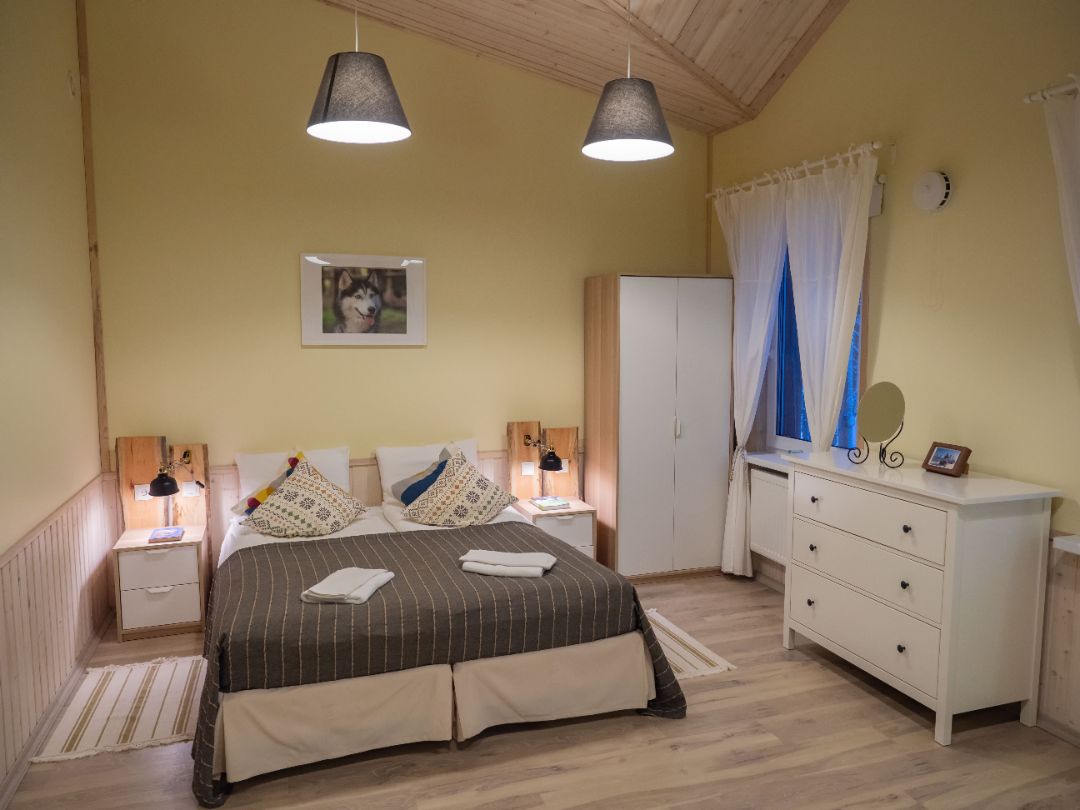 На втором этаже расположены две комфортабельные комнаты. В каждой из них предусмотрена большая двуспальная кровать, которую, при желании гостей, легко можно трансформировать в две односпальные. У окна располагается удобный диван, который так же трансформируется в двуспальную кровать.